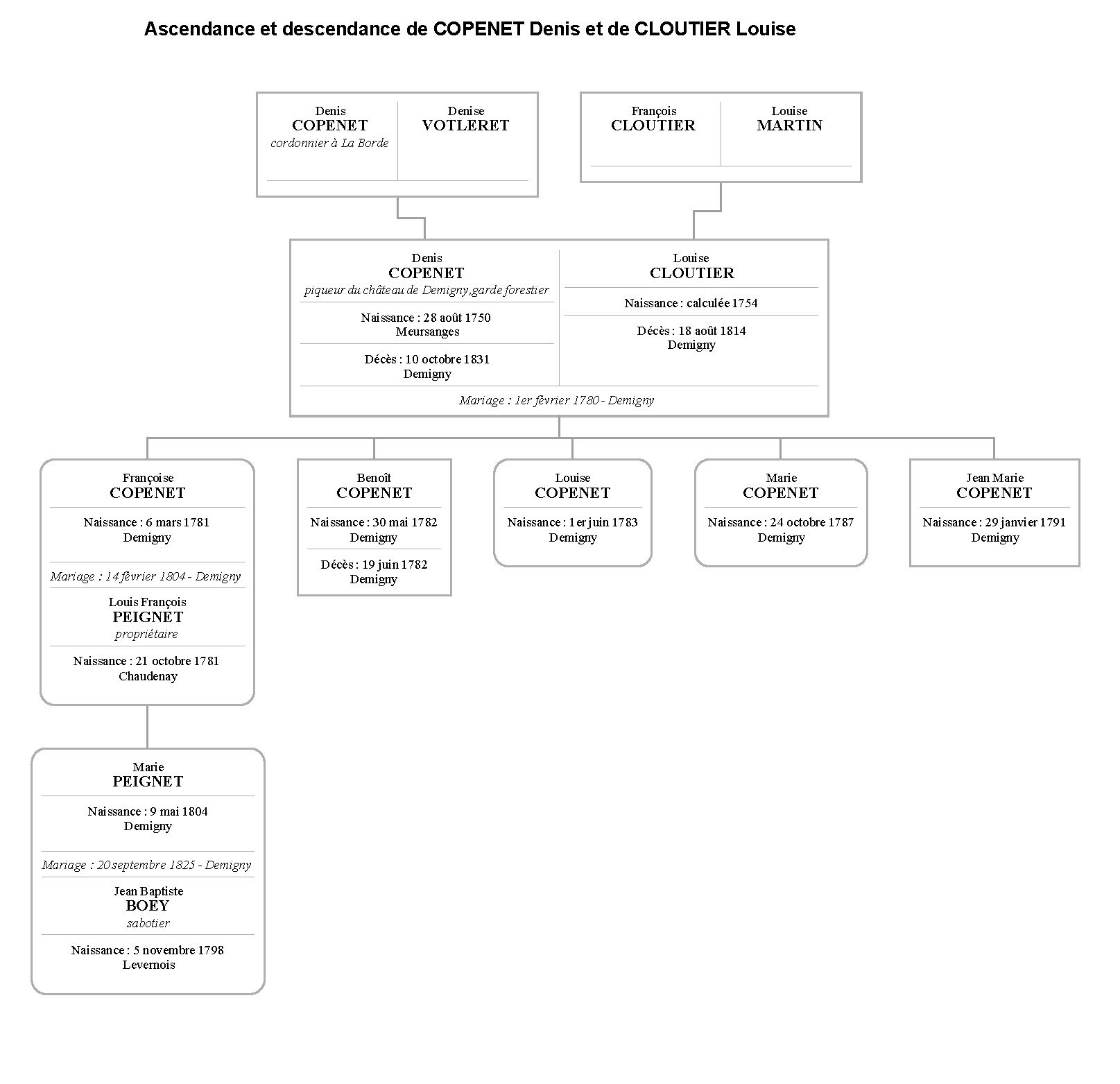 Denis Copenet est né le 19/08/1757 à Meursange (Meursanges actuellement), il est le fils légitime de Denis Copenet, cordonnier au hameau de La Borde au Château, et de Denise Votleret (extrait registre paroissial). Il épouse le 01/02/1780 Louise Cloutier.