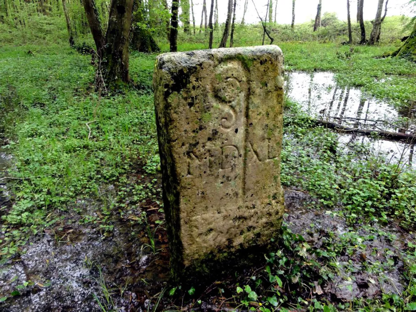 C’est une borne à sommet rectangulaire, gravée sur ses deux faces. La face est comporte une crosse tournée à dextre, qui évoque l’abbaye de Maizières et dont le bâton est accompagné de la date MDXL (1540). Sur la face ouest, on voit un écu ovale [d'azur], à trois fasces [d'argent] (armes des Foudras), sans timbre ni supports, avec au-dessous, la date 1785.