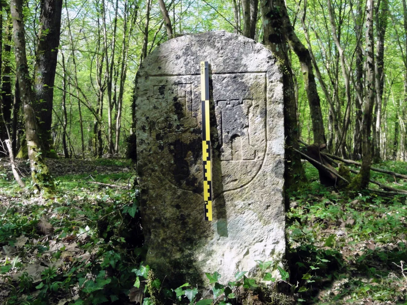 Source : Blog du Centre d'Etude Beaunois Historiques (CEBH) https://cbehblog.wordpress.com/histoire-du-pays-beaunois/demigny/bornes-armoriees-de-lhotel-dieu-de-beaune-en-foret-de-demigny/