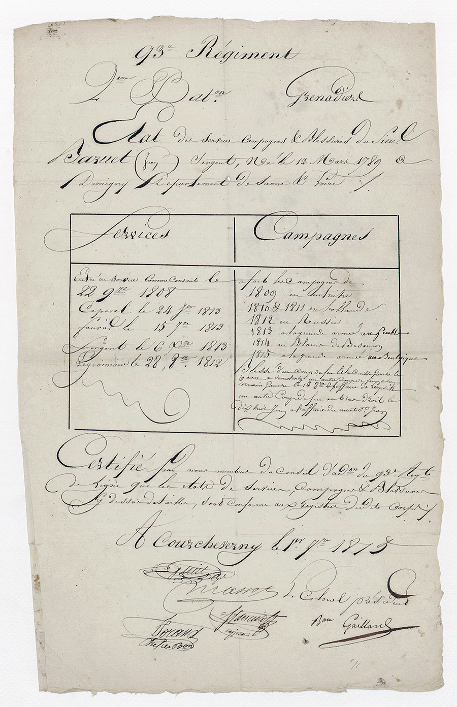 • GOUJON François, né le 09/04/1790, matricule 8811, "1809 à l'Armée du Nord, 1810 - 1811 - 1812, parti en 1813 en Espagne - Fait prisonnier de guerre à ? en Espagne le ? Août 1813. Rentré le 11/06/1814"